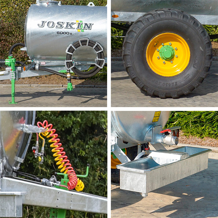 Каждая бочка Aquatrans XL JOSKIN оснащена в стандартной комплектации верхним люком с большим диаметром (Ø 450 мм), гарантирующим заполнение через верх без перелива благодаря достаточной эвакуации воздуха. Быстро открывающаяся крышка является полностью герметичной благодаря широкому уплотнителю (промышленное качество). Для контроля за уровнем заполнения Aquatrans XL укомплектованы прозрачным уровнемером, защищенным отражателем. Последний предотвращает повреждение трубки при контакте с животными или растительностью при перевозке. Сзади бочка в стандартной комплектации оснащена краном 2’’1/2 для точной и быстрой дозировки. Для передвижения по шоссе все бочки Aquatrans XL JOSKIN оснащены в стандартной комплектации двухконтурными пневматическими тормозами (гидравлические доступны в опции), широкими колесами (400R22.5), а также сертифицированными световыми приборами для безопасных перевозок даже в темное время суток.