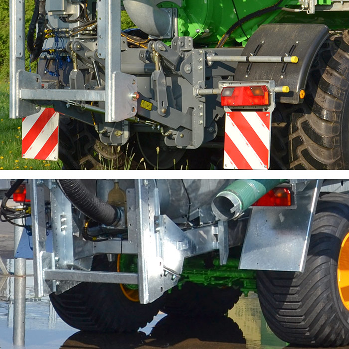 На выходе из цистерны жижа сначала подается в распределительный коллектор большого объема. Последний имеет пластину, отделяющую жижу от посторонних предметов, которая затем делит поток на две части. Эта пластина, выполняющая роль камнеуловителя, направляет посторонние предметы к сливному отверстию, откуда они регулярно эвакуируются. Жижа затем покидает коллектор по трубам диаметром Ø 125 мм и направляется по прямой трубе к форсункам. Коллектор также серийно оснащен правым фланцем 6’’, который используется, например, для установки точного разбрызгивателя (в опции), если требуется разбрызгать органику в более узком месте, чем ширина штанги.