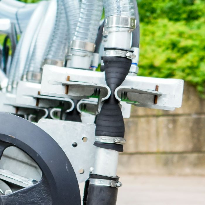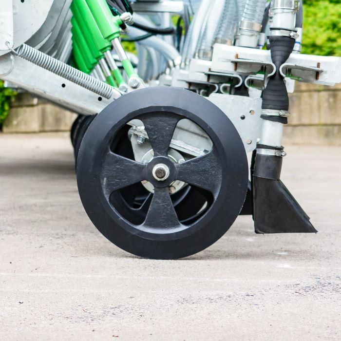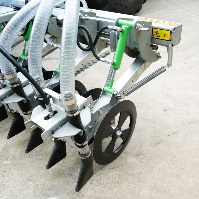 Элементы инжектора имеют по 2 выхода и зафиксированы на шасси при помощи оси. Они могут поворачиваться на 30° (15° вправо и 15° влево), чтобы следовать изогнутой траектории, не приподнимая при этом орудие и не повреждая травостой. Для гарантии долгого срока службы все элементы орудия оцинкованы.