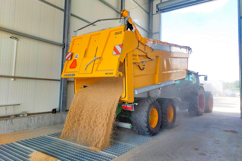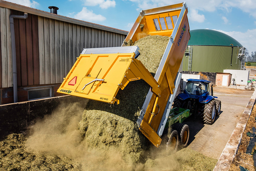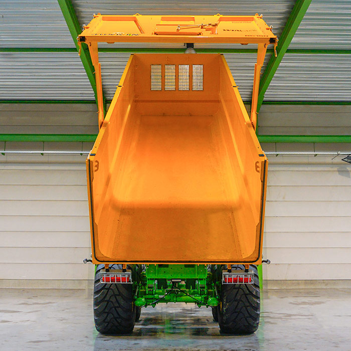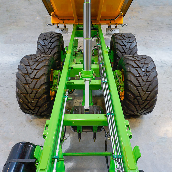 Телескопический цилиндр, обеспечивающий опрокидывание кузова, установлен в передней части под шасси на подвижной двойной раме со смазываемыми подшипниками. Эта система поглощает кручения, возникающие вследствие нагрузок при опрокидывании, и эффективно защищает гидроцилиндр. Позиция гидроцилиндра спереди кузова также способствует более быстрому подъему кузова с рамы. Сдвинутая назад позиция шарниров кузова повышает высоту выгрузки. ‘‘Парашютный’’ клапан, установленный непосредственно на опрокидывающий цилиндр, исключает риск падения кузова, например, при разрыве гидрошлангов. Первые два элемента гидроцилиндра хромированы в стандартной комплектации, эта антикоррозионная защита позволяет оставить кузов на хранении в наклонном положении без риска появления ржавчины. В опции на прицеп можно добавить гидравлический автономный насос с приводом от ВОМа и с (или без) управлением опусканием. Что касается заднего борта с гидравлическим управлением, он открывается при включении гидравлического распределителя ДД трактора и закрывается при помощи механической боковой блокировки. Эта система обеспечивает абсолютную герметичность прицепов-самосвалов JOSKIN, даже при перевозках сыпучих грузов.