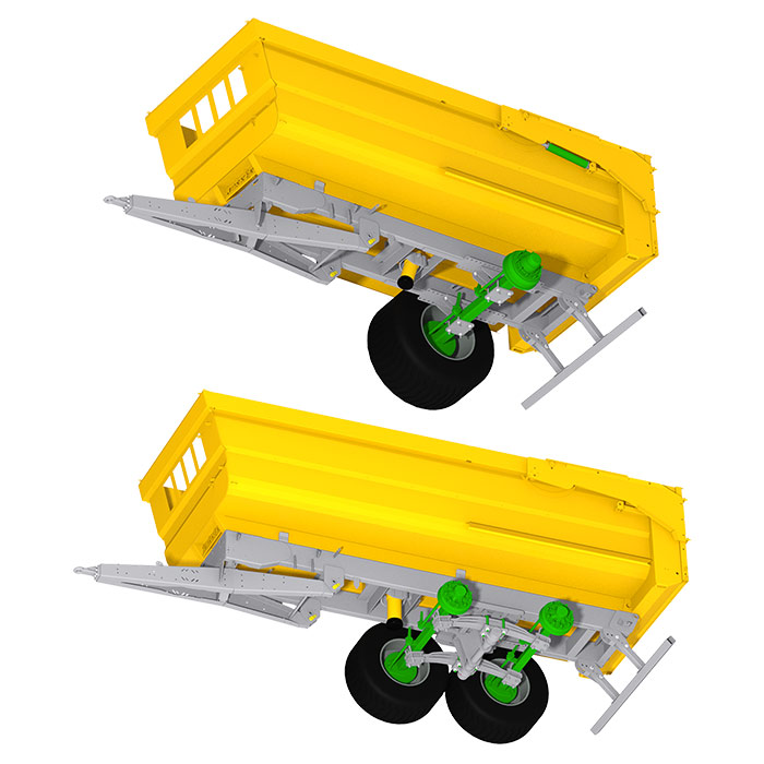 Ходовая часть прицепов-самосвалов Trans-CAP крепится на болтах. Это позволяет изменять нагрузку на тягово-сцепное устройство, а, значит, на заднюю часть трактора, при замене покрышек или высоты сцепки. На моделях Trans-CAP 4500 и 5000 кронштейн оси крепится на болтах. Модели от 5000 до 6500 оснащены ходовой багги Roll-Over с платформой на болтах (вертикальных ход до 24 см). Багги укомплектована параболическими рессорами и отличается большим дорожным просветом, что идеально подходит для работы в поле и гарантирует комфорт при движении.
