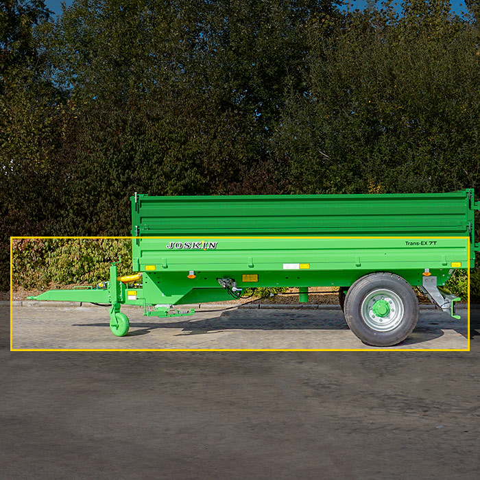 Рама прицепа сочетает простоту и прочность. Прочность гарантирована балками из профилей холодного проката из стали с высоким пределом текучести, обеспечивающими также легкую тягу, сниженный вес и меньшие энергозатраты. Дышло имеет заостренную форму и гарантирует большую маневренность и максимальный угол поворота. Он регулируется по высоте для сцепки с тракторами с малыми или большими колесами. Trans-EX 7 и 9 т оснащены подвеской дышла для лучшего комфорта при езде. Прицеп оснащен стояночной опорой с колесом из стали, позволяющей сдвинуть его на несколько см или м без необходимости сцепки с трактором. Таким образом, он легко может быть перемещен при необходимости (как автомобильный прицеп).