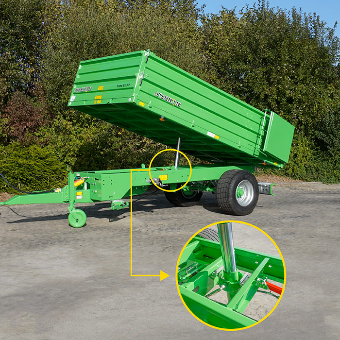 В некоторых ситуациях классическая выгрузка назад не представляется возможной. Нет проблем, в этом случае поможет опция «3-стороннее опрокидывание» (выгрузка назад, вправо и влево). Гидроцилиндр опрокидывания расположен спереди для обеспечения лучшего угла и упрощения выгрузки. Для предупреждения кручения он установлен на двойной поворотной раме.
