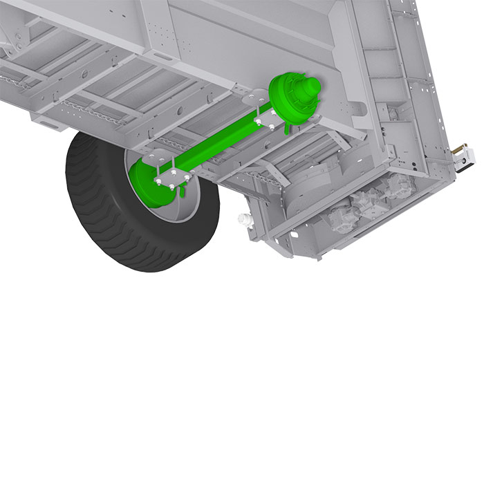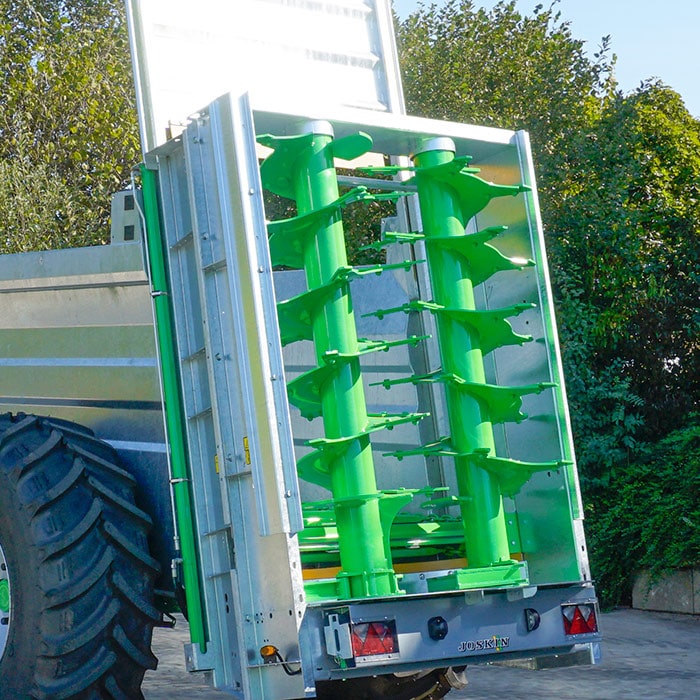 Расход в тоннах на гектар регулируется скоростью движения трактора в комбинации со скоростью транспортера (потенциометр расположен в кабине). В этом также может помочь оцинкованная дверь-гильотина. Привод спиралей осуществляется со стороны трактора посредством карданного вала Walterscheid с защитой срезным болтом. Вал приводит со скоростью 1000 об/мин редукторы, соединенные с двумя валами. Внушительные габариты валов гарантируют проход массы и измельчение продукта, даже если последний был загружен с горкой.