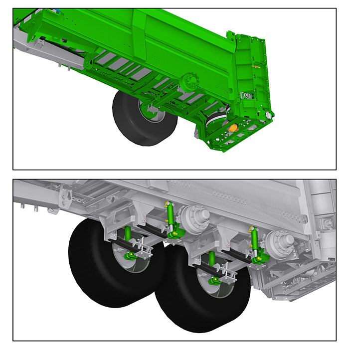 Ось одноосного Tornado крепится болтами под кузовом. Она может быть перемещена для достижения равновесия посредством переноса нагрузки на тягово-сцепное устройство с любым типом колес. Эта конструкция, также как и установка колес большого диаметра, не затронули ни гидравлический мотор транспортера, ни другие выступающие элементы. Серьга, крепящаяся на болтах, может быть легко заменена в любой момент без модификации структурных элементов машины.