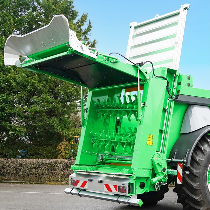 Ширина разбрасывания в целом варьируется от 12 до 22 м в зависимости от разбрасываемого продукта. Для этого два горизонтальных вала (Ø 600 мм на трубе Ø 140 мм) вращаются со скоростью 320 об/мин, чтобы измельчить массу передвигаемого продукта. Зубья валов изготовлены из специальной стали S700MC (230 x 50 мм) и крепятся на болтах для упрощенной замены в случае их износа. Измельченный материал прокидывается валами, ударяясь о стенку, и падает на диски (Ø 1 040 мм), вращающиеся со скоростью 500 об/мин. 6 регулируемых лопаток, расположенных на дисках, равномерно выкидывают наружу весь измельченный продукт с большой шириной захвата. При работе с волокнистым продуктом (например, со свежим навозом) задняя крышка может быть приоткрыта на 100°, в этом случае работа по разбрасыванию обеспечивается в основном валами. Дозировка на гектар осуществляется посредством комбинации регулировки скорости движения трактора со скоростью транспортера, через терминал Ferti-CONTROL 4000 и оцинкованную дверь-гильотину. Последняя держится на расположенных снаружи цилиндрах для гарантии оптимальной подачи продукта. Валы и диски приводятся от широкоугольного карданного вала Walterscheid с обгонной муфтой со стороны трактора и кулачковой защитой со стороны валов. Кардан в режиме 1000 об/мин приводит редукционную коробку (Rögelberg), с которой соединены два вала и диски. Разбрасывающий механизм Tornado Horizon имеет большую высоту и гарантирует проход массы с горкой и её измельчение.