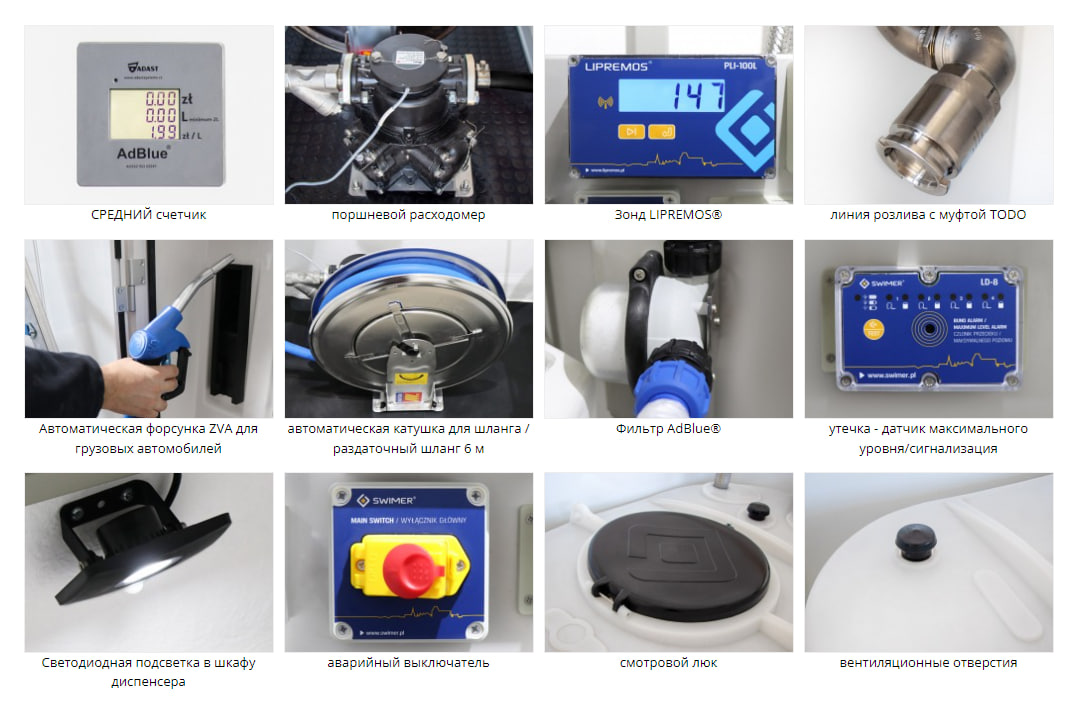 Изготовлен из многослойного ламината на основе полиэфирных смол сэндвич-панелей. Контейнеры оснащены встроенными или внешними легализованными дозаторами MID, которые позволяют продавать AdBlue® в розницу. Доступны также контейнеры для хранения с возможностью подключения внешнего автономного дозатора.