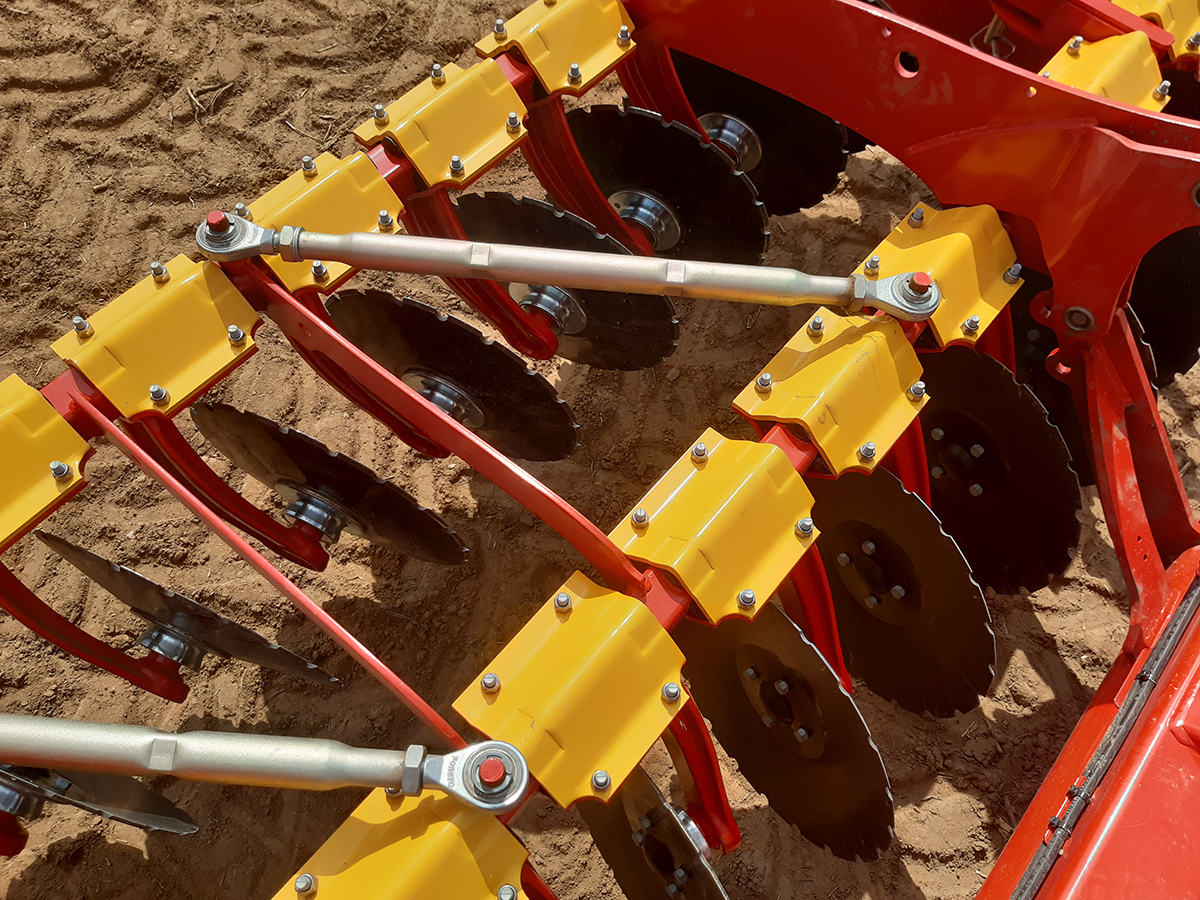 Конические диски диаметром 450мм измельчают и перемешивают. Каждый диск установлен на отдельной стойке с амортизацией, что позволяет сеялке точно копировать рельеф поверхности.