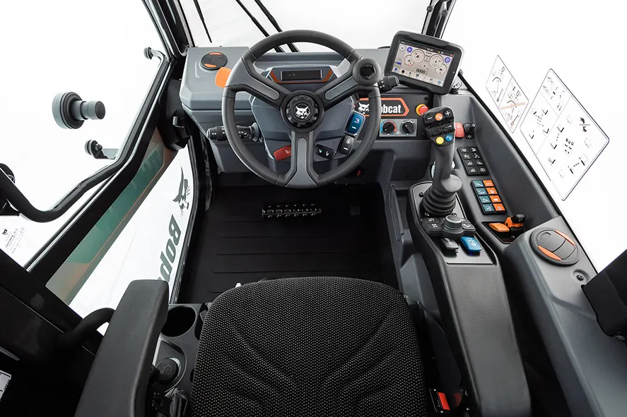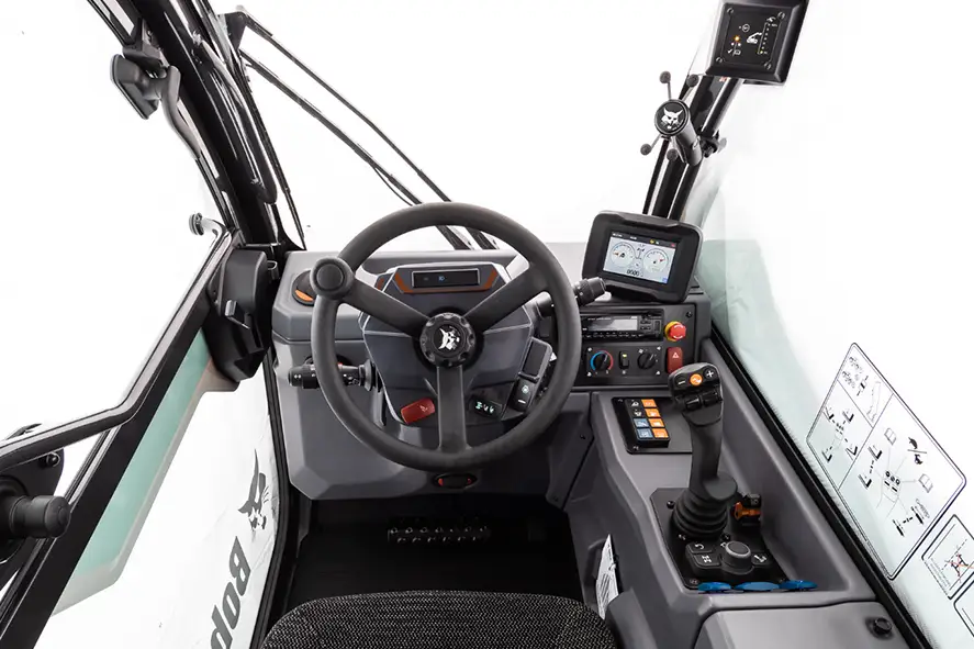 Кабина Bobcat запатентованной асимметричной конструкции с высокопрочным круговым остеклением отличается просторностью и обеспечивает непревзойденный панорамный обзор на 360°. Кабина имеет пять стоек, при этом стойка в правом заднем углу отсутствует, что обеспечивает возможность свободного обзора. Несмотря на такие особенности конструкции кабина гарантирует максимальную степень защиты оператора, включая защиту при опрокидывании и от падающих предметов (ROPS/FOPS).