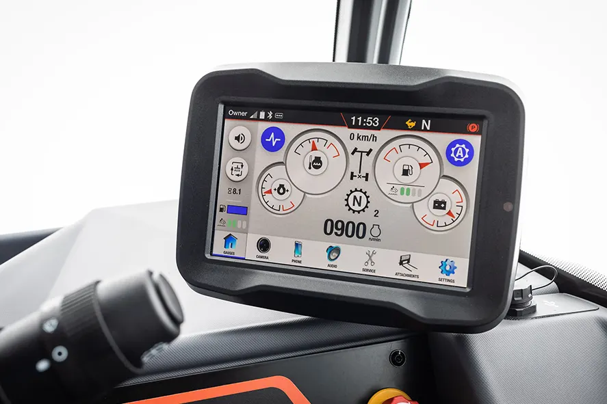 Одновременный вывод на экран всех рабочих параметров в четкой и удобочитаемой форме осуществляется одним нажатием кнопки. Перемещение по меню интуитивно понятно и осуществляется с помощью шайбы управления. Изображение с камеры заднего вида автоматически выводится на дисплей при включении заднего хода (опция). Модели AGRI*** и старше оснащаются 7-дюймовым сенсорным дисплеем (допускается работа в перчатках) со встроенным Bluetooth-приемником и меню управления телефоном. Диспетчер задач Job Manager позволяет оператору сохранить и затем быстро вызывать до 6 настроек параметров, чтобы оперативно их менять при использовании разного навесного оборудования.