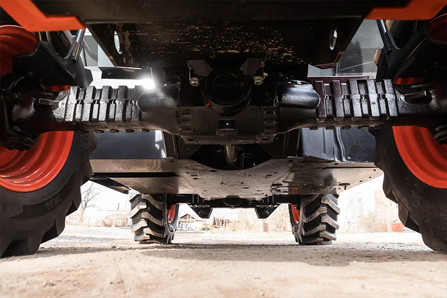 Усиленные мосты Dana-Spicer, оснащенные дифференциалом повышенного трения (только спереди), обеспечивают высокую надежность ходовой части телескопических погрузчиков Bobcat при эксплуатации в тяжелых условиях. Эти мосты, рассчитанные на тяжелые условия эксплуатации, также оснащаются центральным дифференциалом, рабочими тормозными механизмами в масляной ванне, бортовыми редукторами с тремя сателлитами, одним размещенным сверху и защищенным цилиндром рулевого управления и датчиком положения колес для синхронизации их положения при переключении схемы рулевого управления.