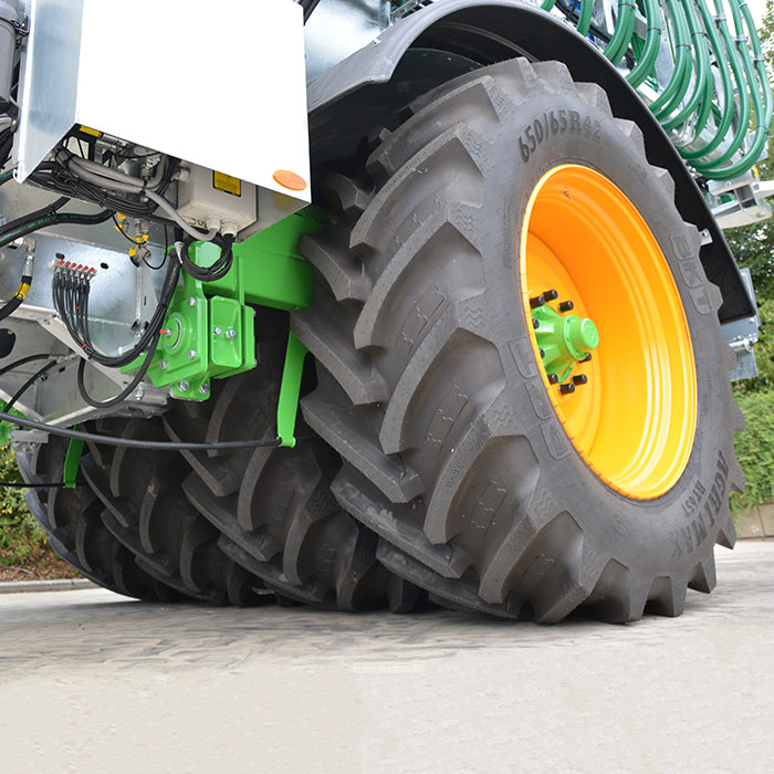 Ходовая часть TETRAX2 представляет собой 2 выровненных поворотных оси с 4 колесами трактора для распределения нагрузки по всей ширине транспортного средства. Маятниковое горизонтальное движение 2 внешних колес обеспечивает устойчивость цистерны при проходе виражей. Оси крепятся на 4 болтах, что гарантирует простой демонтаж и облегчает замену колес при проколе. Все точки смазки ходовой части расположены с каждой из двух сторон машины для обеспечения эффективного и безопасного ежедневного обслуживания.