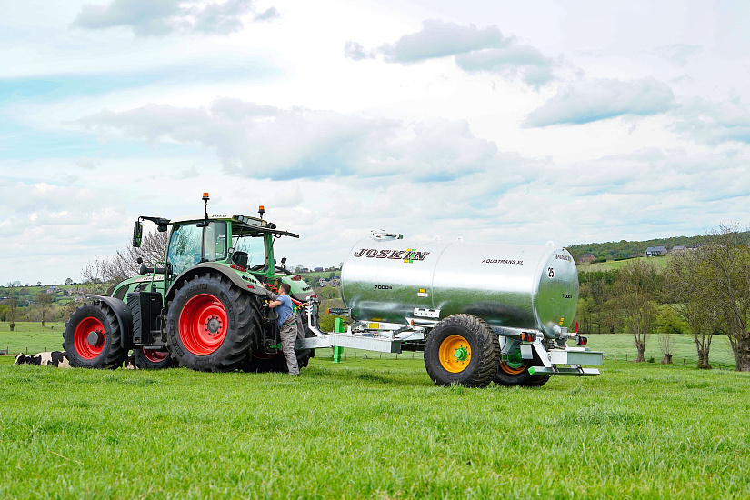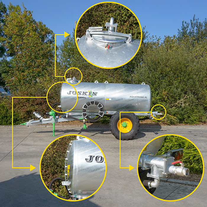 Каждая бочка Aquatrans XL JOSKIN оснащена в стандартной комплектации верхним люком с большим диаметром (Ø 450 мм), гарантирующим заполнение через верх без перелива благодаря достаточной эвакуации воздуха. Быстро открывающаяся крышка является полностью герметичной благодаря широкому уплотнителю (промышленное качество). Для контроля за уровнем заполнения Aquatrans XL укомплектованы прозрачным уровнемером, защищенным отражателем. Последний предотвращает повреждение трубки при контакте с животными или растительностью при перевозке. Сзади бочка в стандартной комплектации оснащена краном 2’’1/2 для точной и быстрой дозировки. Для передвижения по шоссе все бочки Aquatrans XL JOSKIN оснащены в стандартной комплектации двухконтурными пневматическими тормозами (гидравлические доступны в опции), широкими колесами (400R22.5), а также сертифицированными световыми приборами для безопасных перевозок даже в темное время суток.
