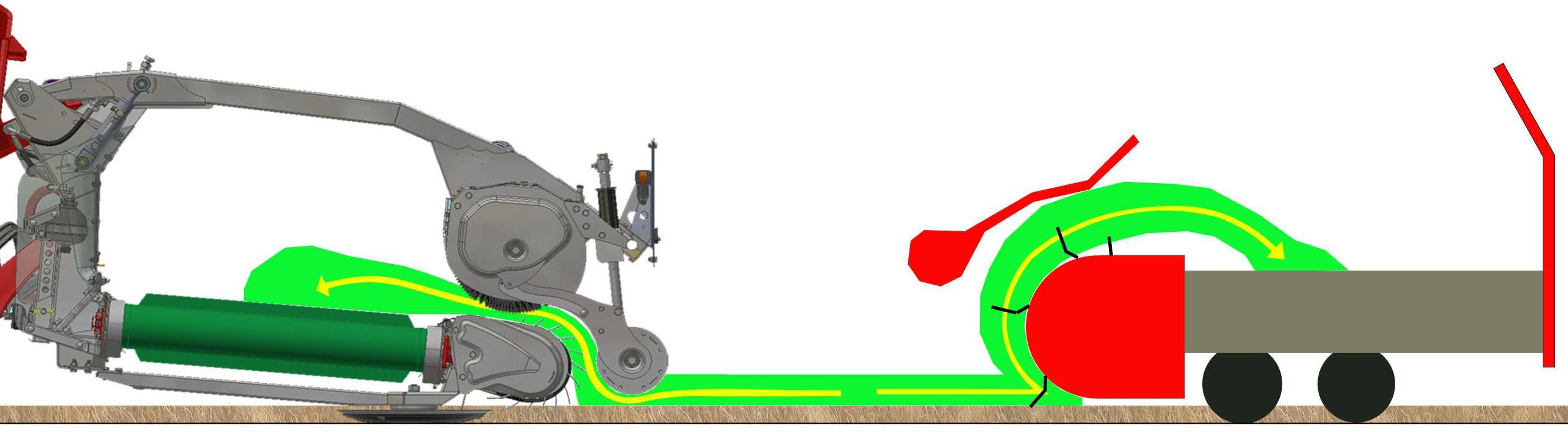 - Валкообразующий каток направляет поток урожая к подборщику