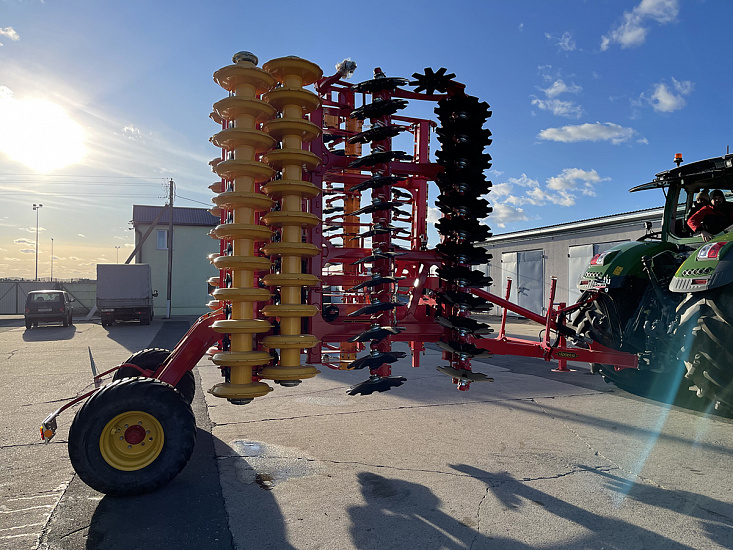 Конические диски, расположенные по центру машины в два ряда, агрессивно разрезают почву. Благодаря большому диаметру дисков (TrueCut V-диск 610мм) машина эффективно дискует большие объемы пожнивных остатков на глубине до 18 см при увеличенной рабочей скорости до 15-20 км/ч.