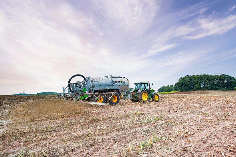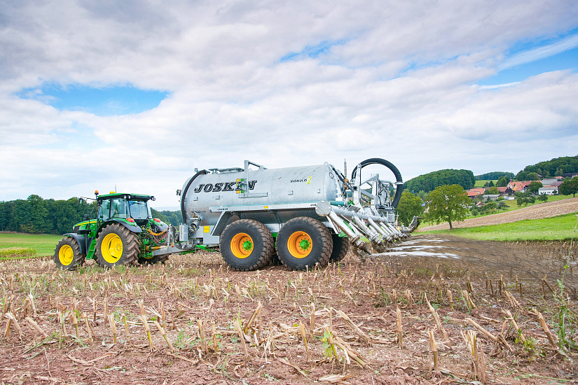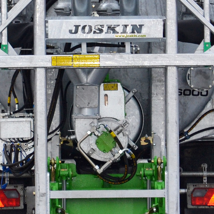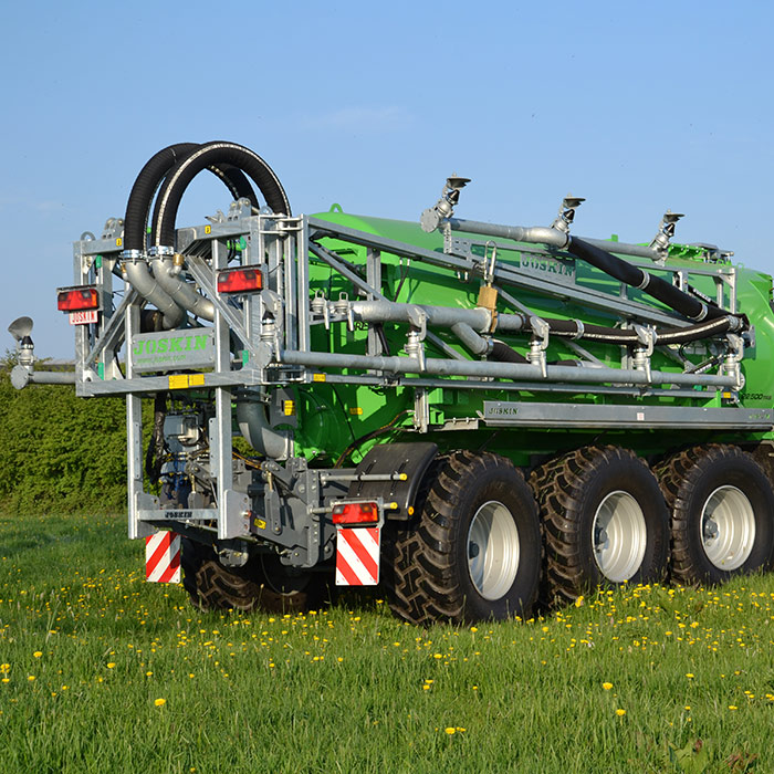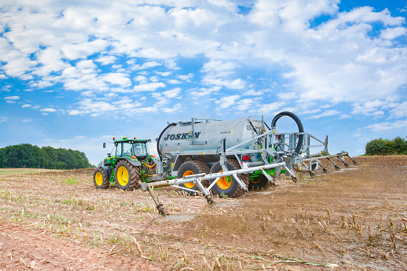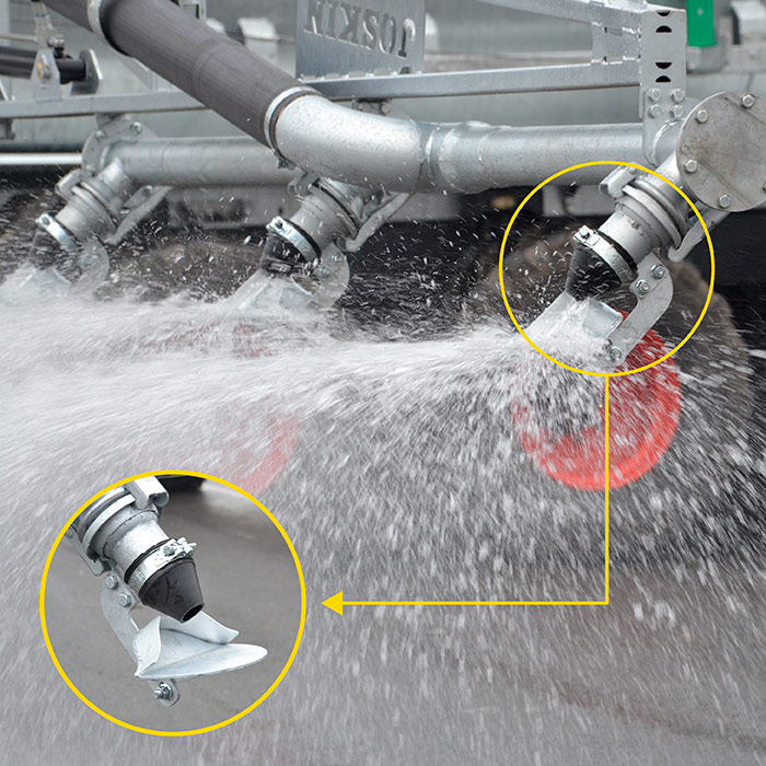 Штанги с форсунками Multitwist JOSKIN позволяют равномерно разбрызгать жижу с шириной захвата 12 и 15 м. Это орудие состоит из двух главных насадок (Ø 125 мм), установленных на треугольную структуру. Каждая из них располагает разбрызгивающими форсунками, расположенными с интервалом 1,5 м. Каждая оснащена отражательной пластиной, которая направляет жижу к земле в форме зонтиков. Благодаря этому, струя меньше чувствительна к ветру и потери аммиака существенно снижаются.