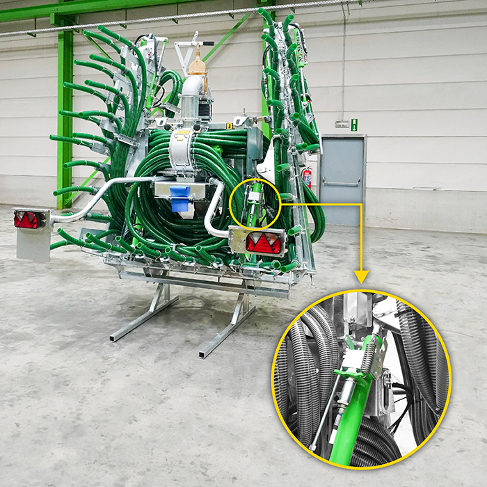 Устройство TWIST, поднимающее штангу вверх, предотвращает стекание навоза на проезжую часть и в поле при маневрировании. Lock Matic является предохранительным устройством для штанги при движении по шоссе в транспортном положении: она автоматически блокируется в упорах, встроенных в её раму. Другим важным преимуществом является автономная система двойного складывания сзади емкости. Последняя позволяет сохранить максимально компактные габариты в транспортном положении и не требует установки дополнительных креплений на ёмкость.