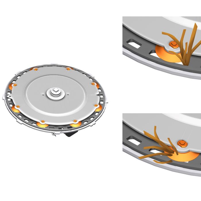 Элементы инжектора имеют по 2 выхода и зафиксированы на шасси при помощи оси. Они могут поворачиваться на 30° (15° вправо и 15° влево), чтобы следовать изогнутой траектории, не приподнимая при этом орудие и не повреждая травостой. Для гарантии долгого срока службы все элементы орудия оцинкованы.