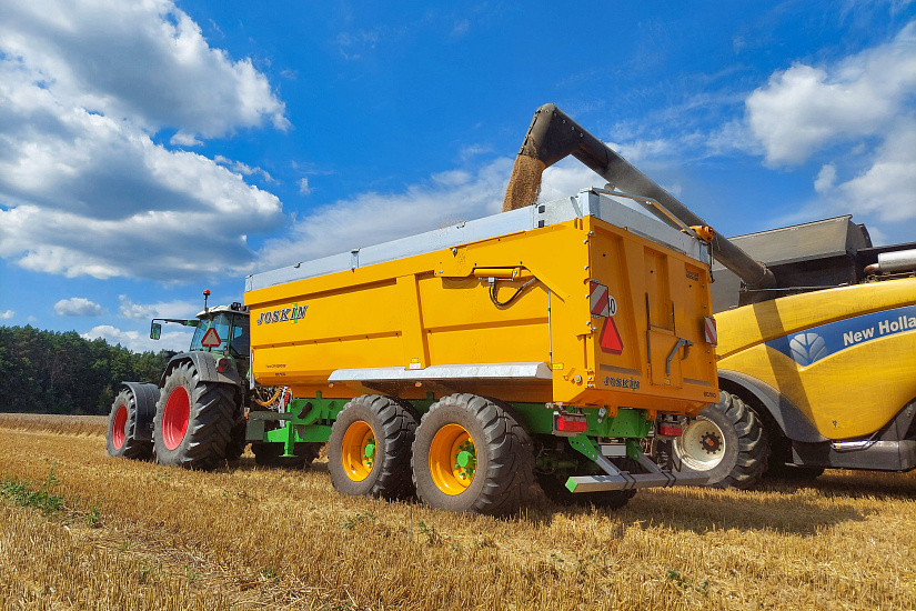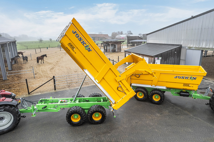 Телескопический цилиндр, обеспечивающий опрокидывание кузова, установлен в передней части под шасси на подвижной двойной раме со смазываемыми подшипниками. Эта система поглощает кручения, возникающие вследствие нагрузок при опрокидывании, и эффективно защищает гидроцилиндр. Позиция гидроцилиндра спереди кузова также способствует более быстрому подъему кузова с рамы. Сдвинутая назад позиция шарниров кузова повышает высоту выгрузки. ‘‘Парашютный’’ клапан, установленный непосредственно на опрокидывающий цилиндр, исключает риск падения кузова, например, при разрыве гидрошлангов. Первые два элемента гидроцилиндра хромированы в стандартной комплектации, эта антикоррозионная защита позволяет оставить кузов на хранении в наклонном положении без риска появления ржавчины. В опции на прицеп можно добавить гидравлический автономный насос с приводом от ВОМа и с (или без) управлением опусканием. Что касается заднего борта с гидравлическим управлением, он открывается при включении гидравлического распределителя ДД трактора и закрывается при помощи механической боковой блокировки. Эта система обеспечивает абсолютную герметичность прицепов-самосвалов JOSKIN, даже при перевозках сыпучих грузов.