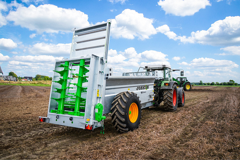 Расход в тоннах на гектар регулируется скоростью движения трактора в комбинации со скоростью транспортера (потенциометр расположен в кабине). В этом также может помочь оцинкованная дверь-гильотина. Привод спиралей осуществляется со стороны трактора посредством карданного вала Walterscheid с защитой срезным болтом. Вал приводит со скоростью 1000 об/мин редукторы, соединенные с двумя валами. Внушительные габариты валов гарантируют проход массы и измельчение продукта, даже если последний был загружен с горкой.