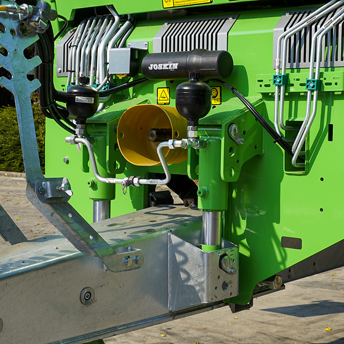 Все модели разбрасывателей навоза Tornado оснащены в стандартной комплектации гидравлической подвеской дышла. Принцип функционирования подвески заключается в расположении гидроцилиндра с двух сторон дышла в комбинации с азотными аккумуляторами. Эта машина обеспечивает не только комфорт при движении даже с большой скоростью, но и позволяет поддерживать постоянную линию тяги без деформации, в том числе, при полной загрузке. Таким образом, оператор может передвигаться с высокой скоростью (до 40 км/ч) на участках с любым рельефом.
