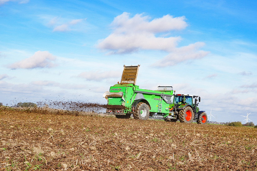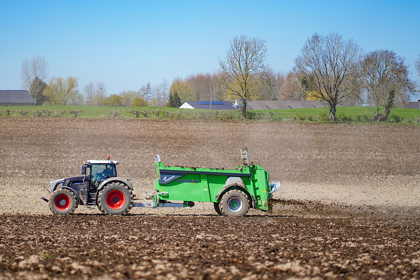 Ширина разбрасывания в целом варьируется от 12 до 22 м в зависимости от разбрасываемого продукта. Для этого два горизонтальных вала (Ø 600 мм на трубе Ø 140 мм) вращаются со скоростью 320 об/мин, чтобы измельчить массу передвигаемого продукта. Зубья валов изготовлены из специальной стали S700MC (230 x 50 мм) и крепятся на болтах для упрощенной замены в случае их износа. Измельченный материал прокидывается валами, ударяясь о стенку, и падает на диски (Ø 1 040 мм), вращающиеся со скоростью 500 об/мин. 6 регулируемых лопаток, расположенных на дисках, равномерно выкидывают наружу весь измельченный продукт с большой шириной захвата. При работе с волокнистым продуктом (например, со свежим навозом) задняя крышка может быть приоткрыта на 100°, в этом случае работа по разбрасыванию обеспечивается в основном валами. Дозировка на гектар осуществляется посредством комбинации регулировки скорости движения трактора со скоростью транспортера, через терминал Ferti-CONTROL 4000 и оцинкованную дверь-гильотину. Последняя держится на расположенных снаружи цилиндрах для гарантии оптимальной подачи продукта. Валы и диски приводятся от широкоугольного карданного вала Walterscheid с обгонной муфтой со стороны трактора и кулачковой защитой со стороны валов. Кардан в режиме 1000 об/мин приводит редукционную коробку (Rögelberg), с которой соединены два вала и диски. Разбрасывающий механизм Tornado Horizon имеет большую высоту и гарантирует проход массы с горкой и её измельчение.