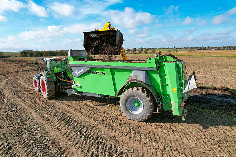 На первый взгляд может показаться, что узкий кузов имеет меньший по сравнению с широким объем. Но при сравнении это оказывается оптической иллюзией. Узкий кузов имеет более низкую посадку и более высокие борта, чем широкий кузов, что упрощает операцию по загрузке. Монолитный кузов и различные компоненты как дышло и рама разбрасывающих валов изготовлены из стали ВПТ. Последняя характеризуется своей прочностью, благодаря чему стало возможно отказаться от боковых усилителей кузова и значительно снизить собственный вес. Для максимальной и долговременной защиты на разбрасыватели Tornado нанесена 2-компонентная краска промышленного качества. Кузов высотой 1 370 мм доступен у версиях объемом от 11,50 до 17,60 м³ (или больше в случае надставных бортов). Транспортер состоит из четырех цепей Ø 16 мм категории 80 (самая высокая категория из всех существующих тяговых цепей) и оцинкованных планок на болтах с закрытым профилем. Транспортер (с редуктором Ø 60 мм) оснащен боковыми натяжными легко доступными устройствами. Кузов образует прямолинейный канал, по которому навоз направляется к разбрасывающему механизму. Поскольку последний шире кузова (снаружи и внутри), передвигаемый транспортерами продукт распределяется по всей ширине перед измельчением разбрасывающими валами и выбросом дисками с лопатками.