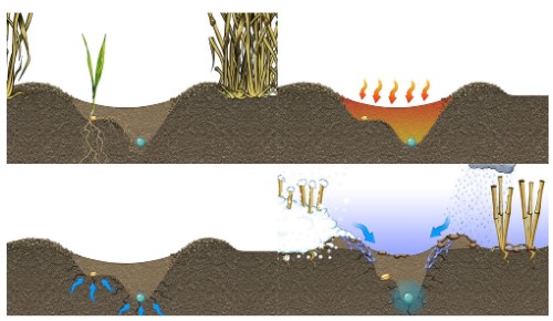 Чтобы вызвать рост семян, в посевной борозде должна быть достигнута правильная температура. Борозда, созданная зубчатым сошником, действует аналогично полосовой обработке, где полоса нагревается быстрее, чем окружающая почва, ускоряя процесс прорастания. Более высокие температуры также увеличивают поглощение удобрений и ускоряют минерализацию, еще больше усиливая рост растений. Кроме того, стерня не дает ветру охлаждать поверхность.