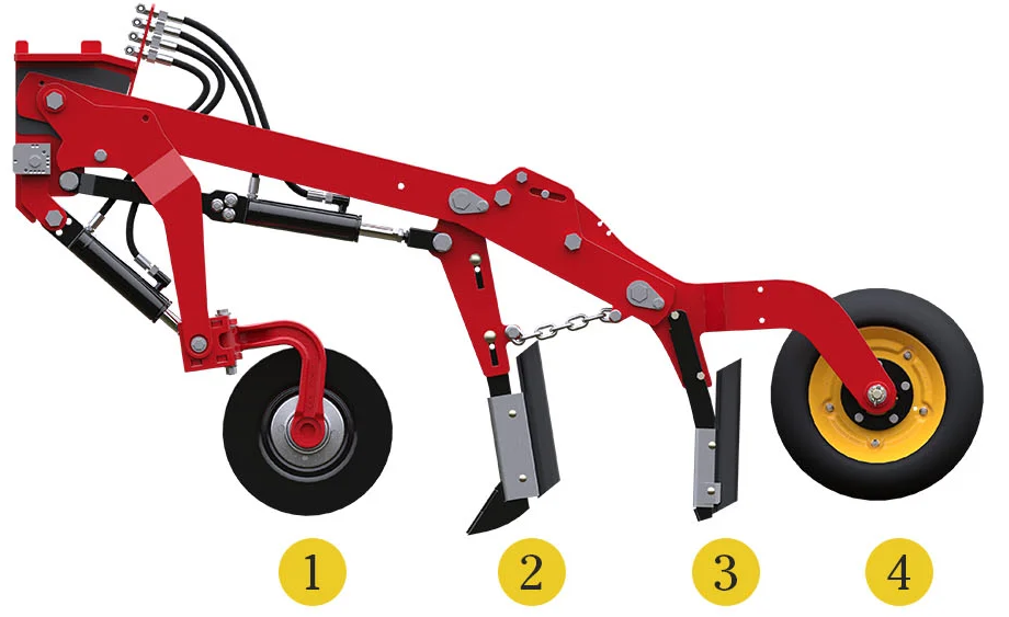 Передний диск установлен с отдельным гидравлическим цилиндром, что позволяет поднимать или опускать его независимо от зубчатого сошника. Он рассчитан на длительный срок службы, оснащен специально закаленным шведским стальным диском V-55 и необслуживаемыми подшипниками. Диск работает в рычажном механизме, что делает его нечувствительным к поворотам. Рычажный механизм установлен с коническими втулками для минимизации износа.