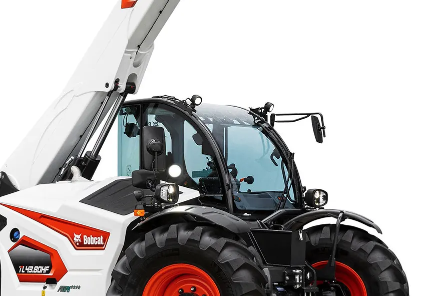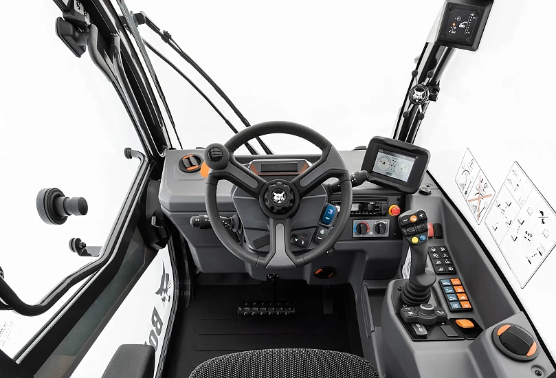 Кабина Bobcat запатентованной асимметричной конструкции с высокопрочным круговым остеклением отличается просторностью и обеспечивает непревзойденный панорамный обзор на 360°. Кабина имеет пять стоек, при этом стойка в правом заднем углу отсутствует, что обеспечивает возможность свободного обзора. Несмотря на такие особенности конструкции кабина гарантирует максимальную степень защиты оператора, включая защиту при опрокидывании и от падающих предметов (ROPS/FOPS).