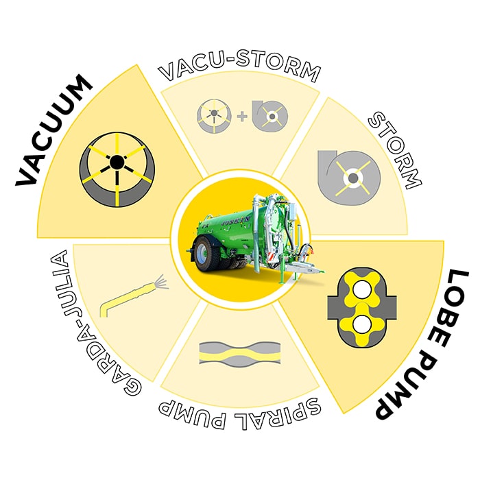 Все TETRAX2 могут быть оснащены различными насосами: от вакуумного до объемного насоса с лопастями. Вакуумный насос спрятан в V-образное дышло и защищён от случайного контакта с колёсами трактора. Лопастной насос установлен сбоку для облегченного техобслуживания. Измельчитель Rotation-Cut, укомплектованный улавливателем для камней, также поставляется в данной конфигурации для максимальной защиты винта от возможного попадания посторонних предметов. Насос приводится от карданного вала с боковым редуктором или от гидравлического мотора (в опции). Доступны все наиболее популярные орудия для всасывания, как фронтальный насосный рукав JUMBO, двойной самонесущий рукав и т.д.
