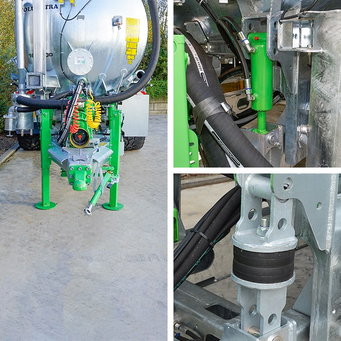 - V-образное дышло (открытого типа) с гидропневматической подвеской (2 азотных аккумулятора для езды порожняком и с грузом)