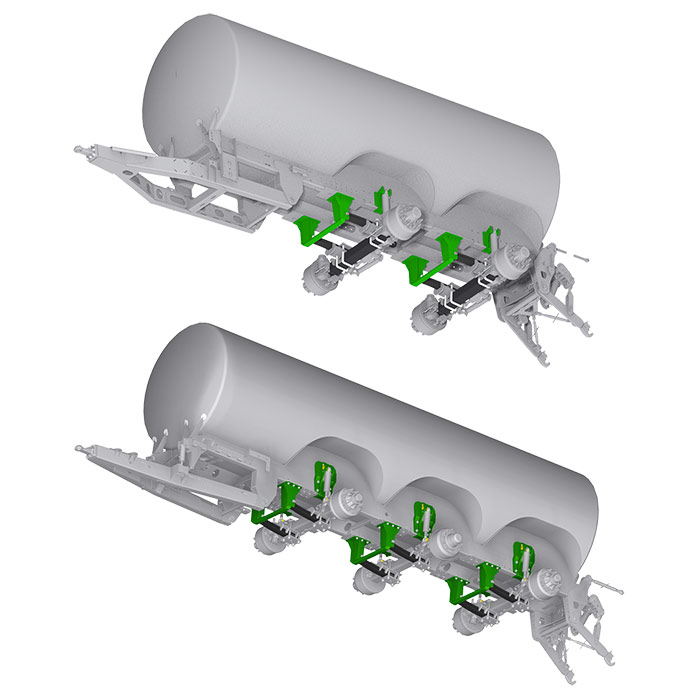 - Hydro-Tridem: гидравлическая подвеска осей (регулируемое на болтах межосевое расстояние 1.600 мм) ручной возврат на уровень