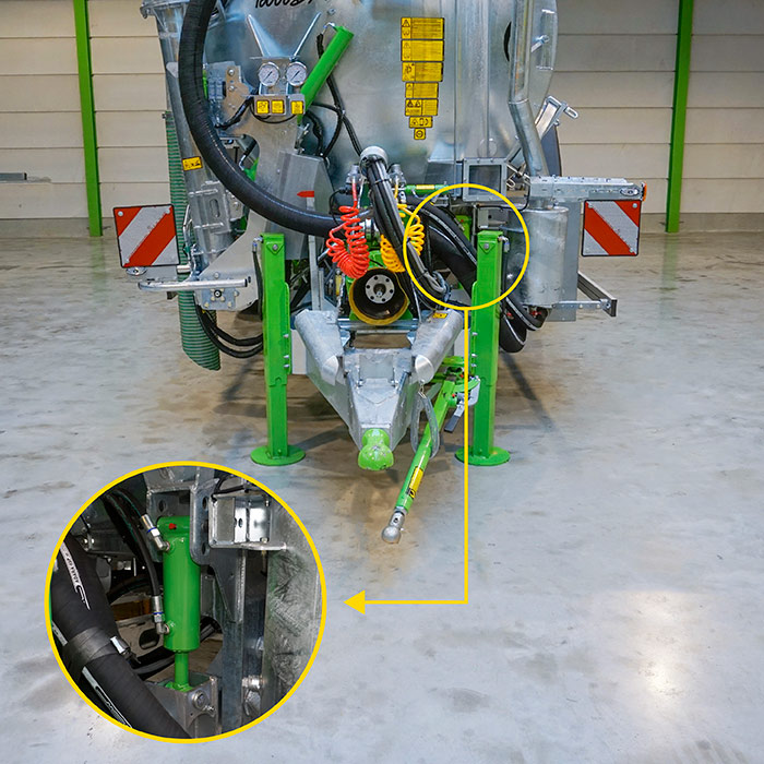 - Двойная направляющая ось с серьгой, вкл. быстроразъемное устройство для сцепки с трактором и центральный узел регулировки для выравнивания, вкл.: 2 азотных амортизатора, масляный резервуар, ручной насос и манометр